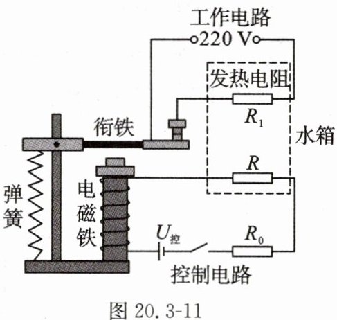 12. 某创新小组设计了如图 20.3 - 11 所示的水温自动控制装置。控制电路中,电压恒为$18V$,定值电阻$R_{0}$为$200\Omega$,$R$为热敏电阻,其阻值随温度的变化情况如表所示。工作电路中,电源电压恒为$220V$,发热电阻$R_{1}$为$20\Omega$。发热电阻和热敏电阻均处于水箱中,电磁铁线圈电阻忽略不计。当控制电路中的电流为$0.06A$时,电磁铁恰好能将衔铁吸下。问: