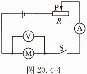 4. 如图 20.4 - 4 所示,电源电压恒为 10 V,滑动变阻器 R 的最大电阻为 20 Ω,直流电动机 M 的额定电压为 6 V,线圈电阻为 2 Ω。当闭合开关 S,滑动变阻器的滑片 P 移到中点时,电动机刚好正常工作,电动机主要将电能转化为