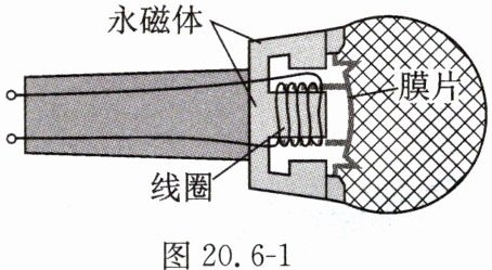 3. 如图 20.6 - 1 所示是动圈式话筒的构造示意图。当你对着话筒说话时,产生的声音使膜片振动,与膜片相连的线圈也跟着一起振动,线圈在磁场中做
