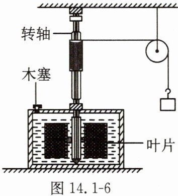 10. 根据能量转化与守恒定律,在与外界没有热传递的情况下,物体增加的内能与外界对物体做的功相等。为了验证此规律,某兴趣小组设计了如图 14.1 - 6 所示的实验:在容器里装入一定质量的水,中间装上带有叶片的转轴,在转轴上缠绕绳子,绳子另一端通过滑轮与一个重物相连;当重物下降时,绳子拉动转轴转动,带动叶片旋转,使容器里水的温度升高,结合水的比热容计算出水增加的内能,以此验证水增加的内能与重物的重力做的功是否相等。(g 取 10 N/kg)