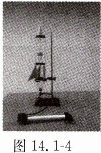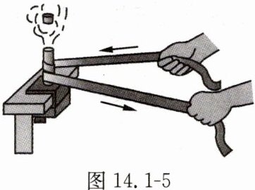 9. 如图 14.1 - 5 所示,将一个薄壁金属筒固定在桌面上,筒里放一些酒精,用塞子将筒口塞紧,拿一根绳子在筒外绕几圈并迅速来回拉动,将会看到塞子跳离筒口,筒口出现白雾。