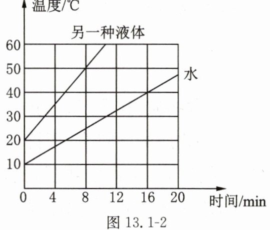 5. 小丽用相同的电加热器分别对质量为$0.2\ \mathrm{kg}$的水和$0.3\ \mathrm{kg}$的另一种液体进行加热,由实验数据她画出两种液体的温度—时间图像如图13.1 - 2所示,则水在$0\sim 16\ \mathrm{min}$吸收的热量为