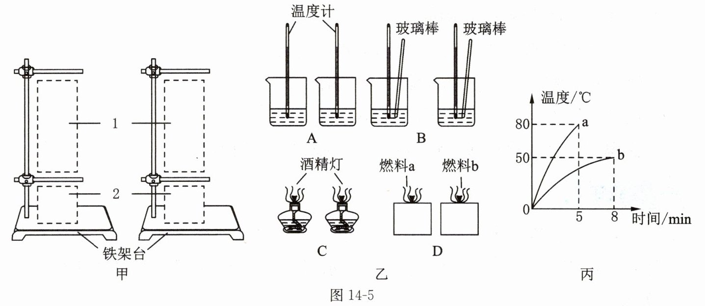 (选填“燃料燃烧相同时间”“燃料燃尽”)时,记下了各个时刻烧杯中水的温度,绘制出了如图 14 - 5 丙所示图像,由此可判断燃料a