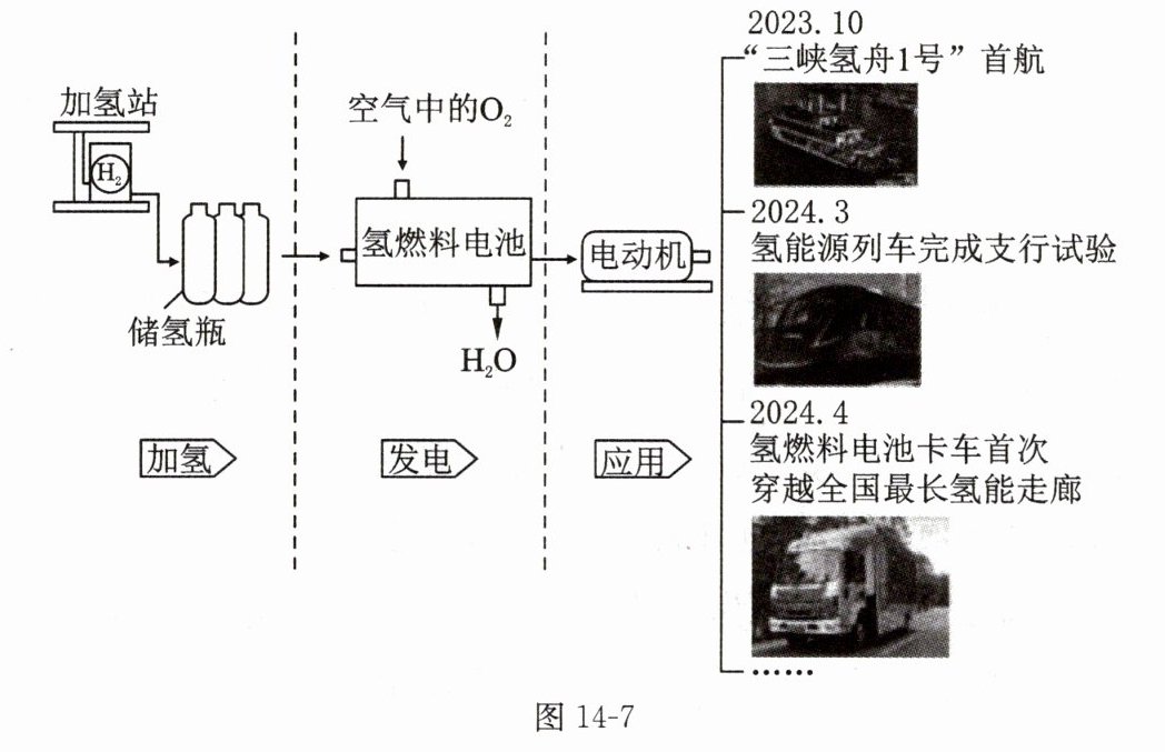 15. 据统计,每燃烧 1 kg 燃油会排放约 3.3 kg 二氧化碳。为实现碳达峰、碳中和的目标,氢能作为一种绿色低碳的清洁能源在我国交通领域的应用场景不断扩大,使用氢燃料电池的交通工具不断丰富,其应用流程如图 14 - 7 所示。