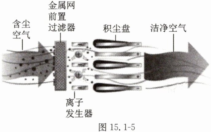 8. 如图 15.1 - 5 所示为静电除尘装置的原理图。当含尘空气经过离子发生器时,空气分子被电离为正离子和电子,正离子使尘粒带正电奔向积尘盘的负极,最终被吸附到积尘盘上。选项中说法正确的是(
