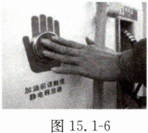 9. 静电现象在生产生活中有许多应用,有时也会给人们的生产生活带来困扰。如图 15.1 - 6 所示,加油站工人提油枪加油前,必须用手触摸静电释放按钮,这个按钮通过导体与大地相连接。这是为了(