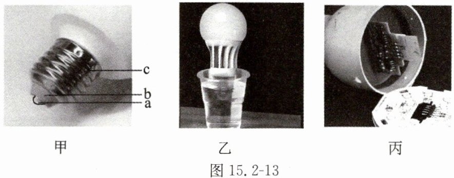 小明逛夜市时,发现有摊主在叫卖一种不消耗电能、遇水就亮的灯泡(如图 15.2 - 13 所示)。小明认为这与物理课上所学知识矛盾,于是买了一个灯泡回家测试。