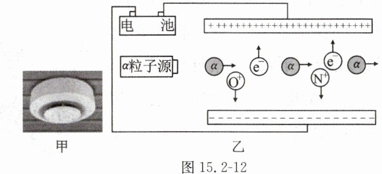 大部分家庭都装有烟雾报警器,通常人们把它装在走廊过道上,当出现大量烟雾,烟雾报警器就会响起来。烟雾报警器是如何工作的呢?如图 15.2 - 12 所示,在烟雾报警器中有一个α粒子源,可以产生α粒子,当α粒子与空气中的氮分子或氧分子撞击时,会把电子从这些分子中打出,这样就产生了电子和带正电荷的氮离子(N⁺)、氧离子(O⁺)。烟雾报警器中有两块板,一块带正电荷,一块带负电荷。电子向带正电荷的板运动,氧离子和氮离子向带负电荷的板运动,这就产生了电流。当电路中有电流时,一切正常。但是,如果空气中有烟雾粒子,一部分α粒子会被烟雾粒子吸收,导致电流减小,触发警报。