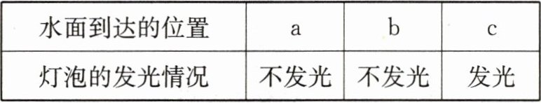 (2) 小明观察到灯泡底部结构由 a、b、c 三部分组成,如甲图所示,a、c 为金属,b 为塑料。如乙图所示,将灯泡缓慢浸入水中,观察灯泡的发光情况,观察到的情况如表所示。