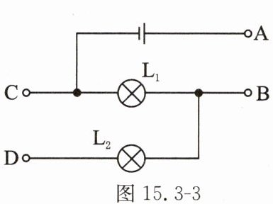 3. 如图15.3 - 3所示,A、B、C、D表示四个接线柱,要使灯泡L₁、L₂串联,则应连接
