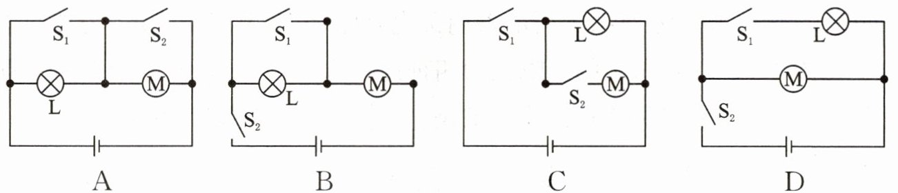 10. 有一种智能锁,需要通过“密码+人脸”两次识别成功才能开锁。密码识别成功时仅开关S₁闭合,灯泡L发光,照亮人脸进行识别,但不开锁,人脸识别成功后开关S₂才会闭合,电动机M工作,开锁成功。选项中的电路设计符合要求的是(