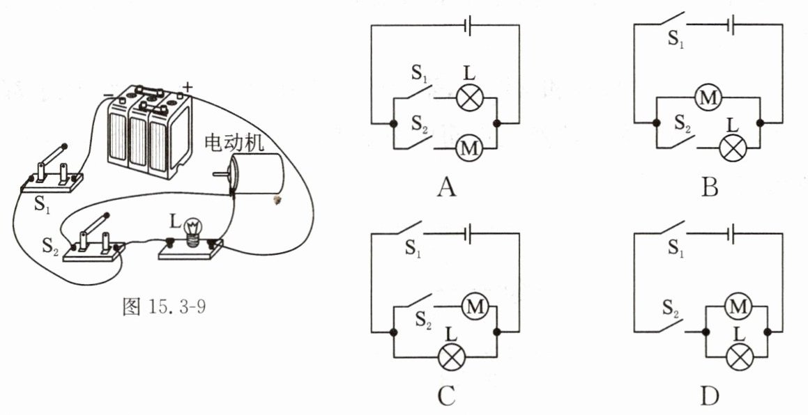 12. 如图15.3 - 9所示是某实验小组连接的实物电路,选项中的电路图与实物电路相对应的是(