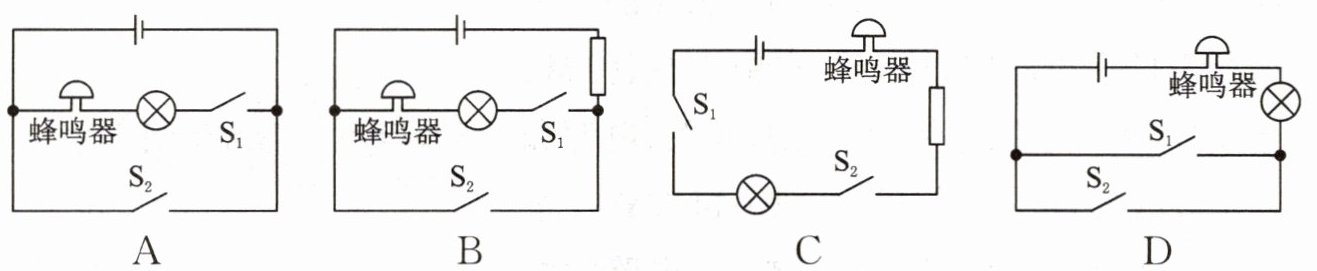 11. 汽车装有安全带未系提示系统,当乘客坐在副驾驶座椅上时,座椅下的开关S₁闭合,若未系安全带,则开关S₂断开,仪表盘上的指示灯亮起,蜂鸣器工作;若系上安全带,则开关S₂闭合,指示灯熄灭,蜂鸣器不工作。选项中设计的电路图符合要求的是(
