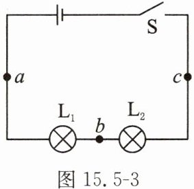 4. 在“探究串联电路中各处电流的关系”的实验中,小明同学选用两个规格不同的小灯泡接入了如图 15.5 - 3 所示的电路中,然后用同一个电流表分别接在 $ a $、$ b $、$ c $ 三点测量不同位置的电流大小,其中一次实验的测量数据如表所示,在分析数据时发现,三点的测量值有差异。选项中说法正确的是(