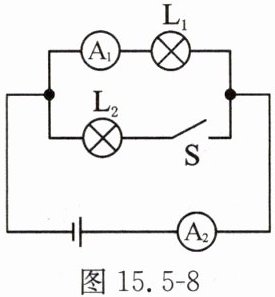 10. 如图 15.5 - 8 所示,在开关 $ S $ 由闭合到断开的过程中,电流表 $ A_1 $、$ A_2 $ 的示数 $ I_1 $、$ I_2 $ 的变化是(