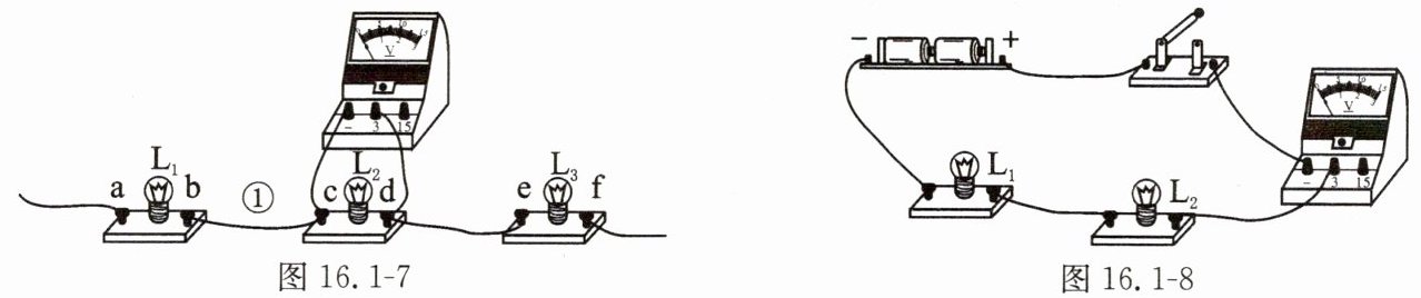 11. 将图 16.1 - 7 所示三个串联的灯泡与电源连接后,灯泡 $ L_{2} $、$ L_{3} $ 发光,$ L_{1} $ 不发光,电压表的指针有明显的偏转。下列说法正确的是(