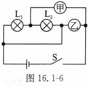10. 如图 16.1 - 6 所示,甲、乙为电流表或电压表。闭合开关 $ S $ 后,要使小灯泡 $ L_{1} $、$ L_{2} $ 均能发光且并联在电路中,则(