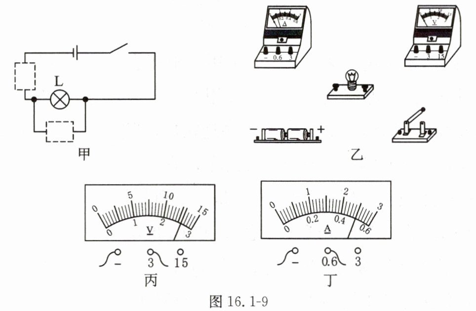 (1) 请你在图 16.1 - 9 甲的虚线框内填入电压表、电流表的符号,并用笔画线表示导线,将图 16.1 - 9 乙中的实物连接起来。
