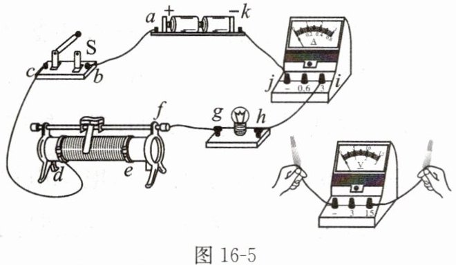 7. 小明同学在做“用滑动变阻器改变电流”的实验时,连接了如图 16 - 5 所示的电路,将滑动变阻器的滑片移动到最大电阻处,闭合开关 $S$,发现小灯泡不亮。电流表无示数。接下来小明用电压表逐一与元件并联,以查找故障,测量得出:$U_{ak}=3\ V$、$U_{kh}=0\ V$、$U_{gh}=0\ V$、$U_{dg}=3\ V$、$U_{ad}=0\ V$。如果电路只有一处故障,则下列说法正确的是(