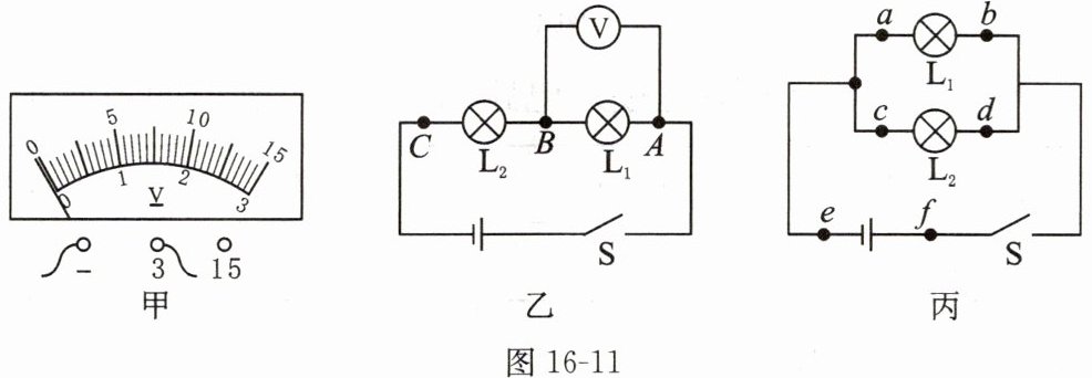 (4) 如图 16 - 11 乙所示,开关闭合后,电压表测灯泡 $L_{1}$ 两端的电压。为了测量 $B$、$C$ 两点间的电压,小明只将连接 $A$ 点的导线改接到 $C$ 点(连接 $B$ 点的导线保持不动),闭合开关后,发现。