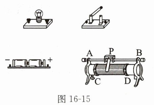 (1) 按要求连接电路:能利用滑动变阻器来改变灯泡的亮度,且当滑片 $P$ 向右移动时灯泡会变亮,请以笔画线表示导线,把图 16 - 15 中的电路连接起来。