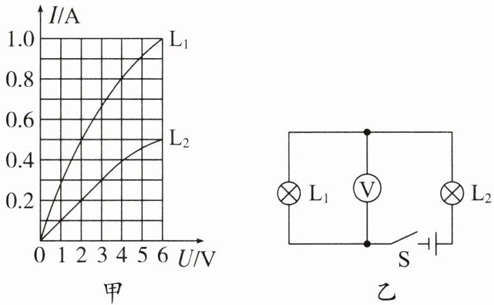 8. 灯泡$L_{1}$(标有“$6\ V\ \ 6\ W$”)和灯泡$L_{2}$(标有“$6\ V\ \ 3\ W$”)的电流和两端电压的关系曲线如图甲所示。现将其按图乙所示的电路连接,闭合开关,灯泡$L_{2}$恰好正常发光,则下列说法正确的是(