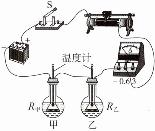 2. (2024·江苏泰州中考)右图是探究影响电流热效应的因素的实验装置,甲、乙两个完全相同的烧瓶内装有等质量的同种液体,阻值分别为$R_{甲}$、$R_{乙}的电阻丝分别浸没在两烧瓶的液体中且R_{甲} \neq R_{乙}$。有下列四种观点: