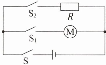 10. (2024·福建中考)小闽设计的车载可加热果蔬搅拌机的工作电路如图所示。电热丝的阻值$R为4\ \Omega$,电动机标有“$12\ V\ \ 24\ W$”字样。闭合开关$S$、$S_{1}$,电动机正常工作。
