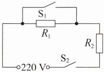 9. 如图所示,某家用电热水壶有高温和低温两挡,已知两定值电阻的阻值$R_{1}与R_{2}$相等,电热水壶在低温挡正常工作时的功率为$484\ W$,则$R_{2}$为