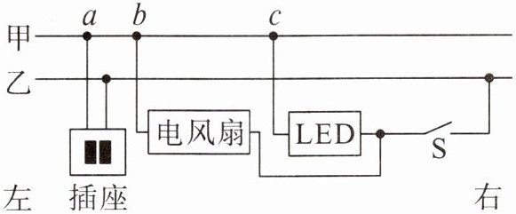 7. (2024·广东广州中考)如图所示,某家庭电路的输电线甲、乙从右端进户。闭合开关 S,LED 灯发光,电风扇正常工作,用测电笔检测插座,只有检测右孔时氖管才发光。由于出现故障,电风扇停止工作,LED 灯仍发光,用测电笔检测插座两孔,氖管均发光。该故障是(