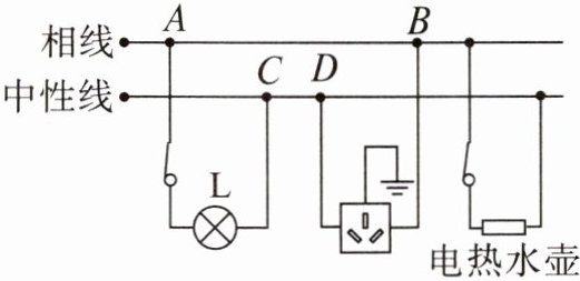 【典型例题5】下图为居民家中某房间的电路,电灯L与电热水壶均正常工作。在三孔插座上接入电饭煲后,电热水壶突然停止工作,电灯L仍正常发光。拔出电饭煲的插头,用测电笔分别测试三孔插座的左、右两孔,氖管均发光,则此电路故障可能是(