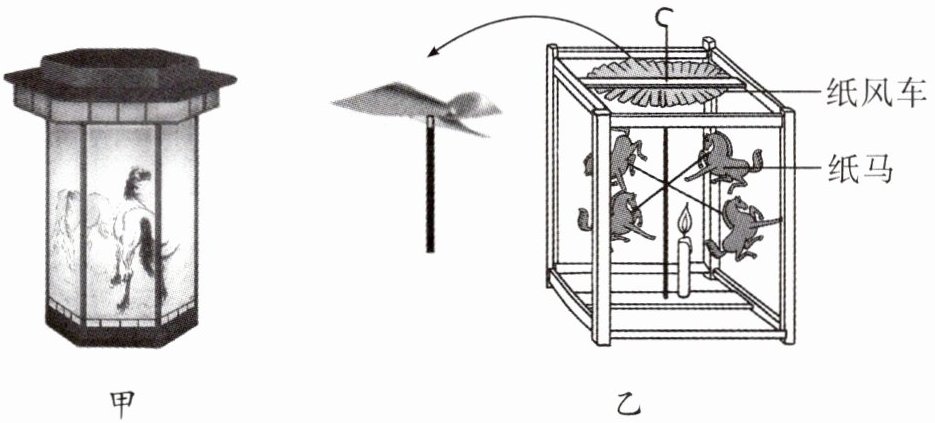 8. 早在秦汉时期,我国就发明了流行于民间的走马灯,如图甲所示。如图乙所示,点燃走马灯内的蜡烛,纸筒内部的空气温度升高,体积膨胀,密度变