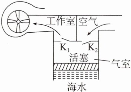9. 下图是世界上第一盏海浪发电航标灯的气室示意图,其工作原理为:当海浪向下运动时,带动活塞向下运动,阀门$K_1$闭合$,K_2$打开,将空气吸入气室;之后海浪推动活塞向上运动,压缩空气到一定程度后,阀门$K_1$打开$,K_2$闭合,将气室内的空气推入工作室,推动工作室中的涡轮机运转,并带动发电机发电。对于此过程,下列说法正确的是(