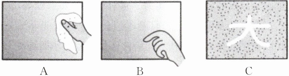 料板上写一个“大”字;C. 将塑料板平放,在上面均匀地撒上一层干木屑,再将塑料板缓慢竖起,随着静止在塑料板上的木屑的滑落,一个“大”字就在塑料板上显现出来了。