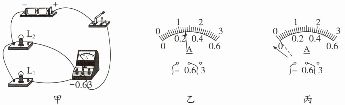 $ A $。 (3) 同桌小刘闭合开关后,发现电流表的指针偏转如图丙所示,原因是