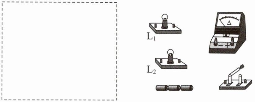 9. 在虚线框中画出灯泡 $ L_1 $ 和灯泡 $ L_2 $ 并联、电流表测通过灯泡 $ L_1 $ 电流的电路图,并连接实物图。