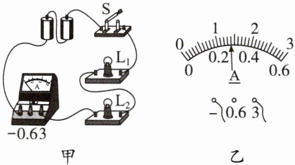 7. 如图甲所示,开关$S$闭合后,两灯都发光,电流表$A$的示数如图乙所示,则通过灯泡$L_1$的电流是