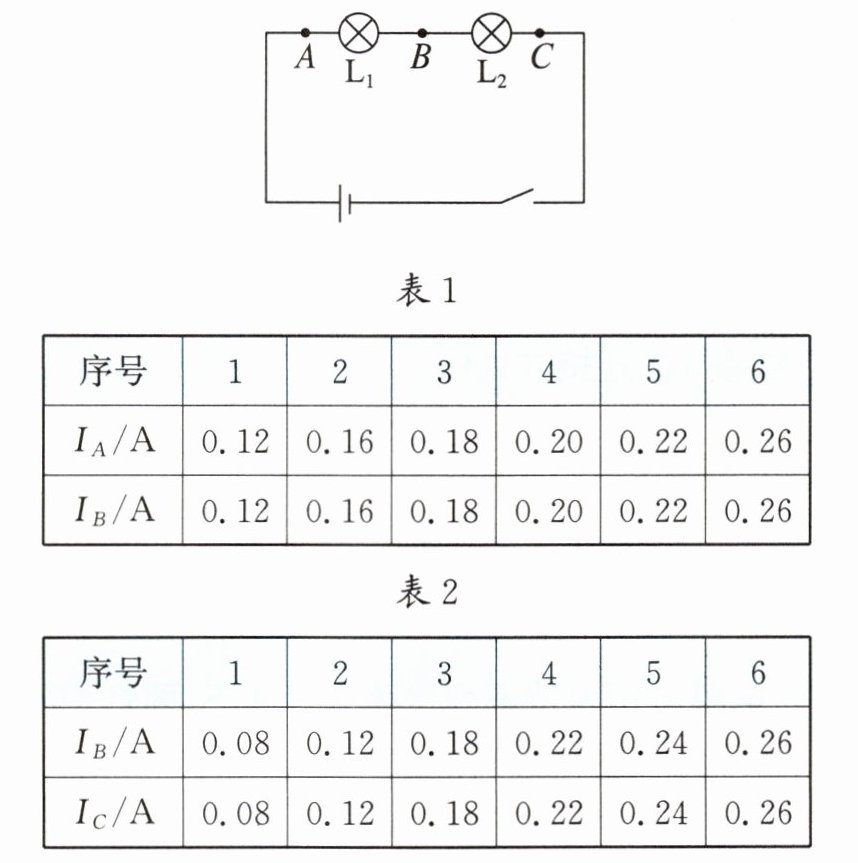8. 小阳用如图所示的电路探究串联电路的电流规律,他利用两个完全相同的电流表、多个不同规格的小灯泡等器材,分别探究了流出小灯泡$L_1的电流I_B与流入小灯泡L_1的电流I_A$的关系、流出小灯泡$L_2的电流I_C与流入小灯泡L_2的电流I_B$的关系,实验数据如表1、表2所示。