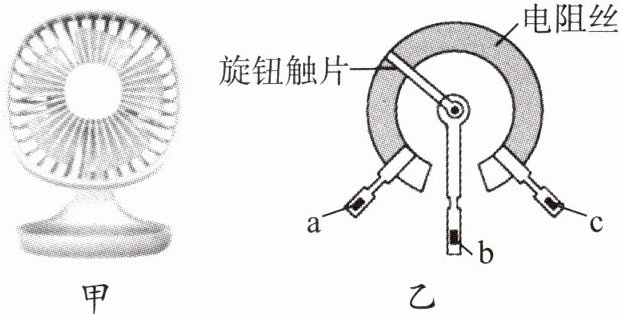 6. 图甲是人们常用的一种可调风速的小风扇,图乙为其用于调节风速的机械式电位器结构图,a、b、c是它的三个接线柱,a、c分别与弧形电阻丝的两端相连,b与旋钮触片相连。该风扇的风速与机械式电位器接入电路中的电阻值成负相关关系。下列有关说法正确的是(
