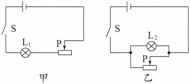 7. 如图所示,两个电路中电源电压保持不变,闭合开关S,当滑动变阻器的滑片P都向右滑动时,灯泡$L_1$和$L_2$的亮度变化是(