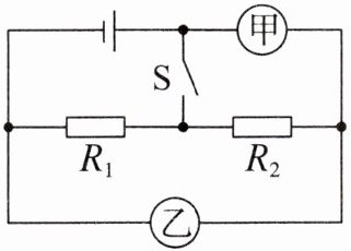【典型例题 1】如图所示,甲、乙为电流表或电压表。当闭合开关 S 后,阻值分别为 $R_1$、$R_2$ 的两个定值电阻并联,电路正常工作,则(