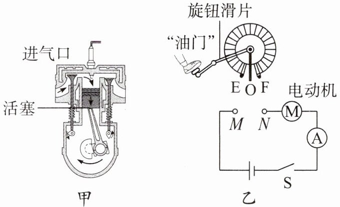 (2)图乙中的 E、O、F 为变阻器的三个接线柱,驾驶员踩下“油门”时,电路中变阻器的阻值减小,电流变大而加快电动机的转速,用笔画线代表导线将变阻器接入电路 $M$、$N$ 处。