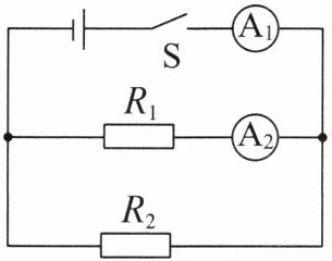 3. 将阻值$R_{1}为10\Omega的电阻器与另一阻值为R_{2}$的电阻器接入电源电压恒定的电路,如图所示。闭合开关S,电流表$A_{1}$的示数为0.45A,电流表$A_{2}$的示数为0.3A,则通过阻值为$R_{2}$的电阻器的电流为