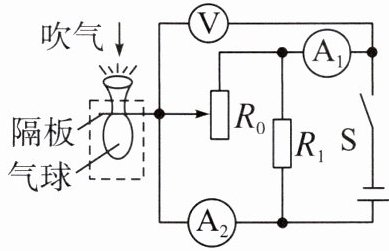 4. (2024·四川德阳中考)2024年3月,德阳市青少年科技创新代表队在第38届四川省青少年科技创新大赛中取得优异成绩。下图是本次大赛德阳市青少年科技创新小组自制的肺活量比较装置,通过观察电流表示数的变化即可比较肺活量的大小。滑动变阻器的阻值为$R_{0}$,定值电阻的阻值为$R_{1}$,电压表、电流表为理想电表,电源电压保持不变。现闭合开关S,科技创新小组成员向装置吹气,隔板向上平移,滑动变阻器接入电路的阻值变小,下列说法正确的是(