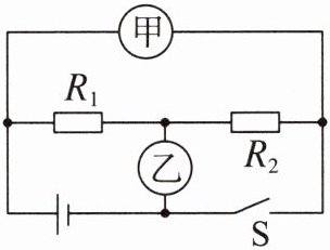 【典型例题4】如图所示,电源电压U保持不变,定值电阻A、B的阻值分别为R_1、R_2。在甲、乙两处分别接入电压表,闭合开关S,测得$ U_{甲}:U_{乙}= 3:2 $;断开开关S,拆去电压表,并在甲、乙两处分别接入电流表,此时$ I_{甲}:I_{乙} $是(