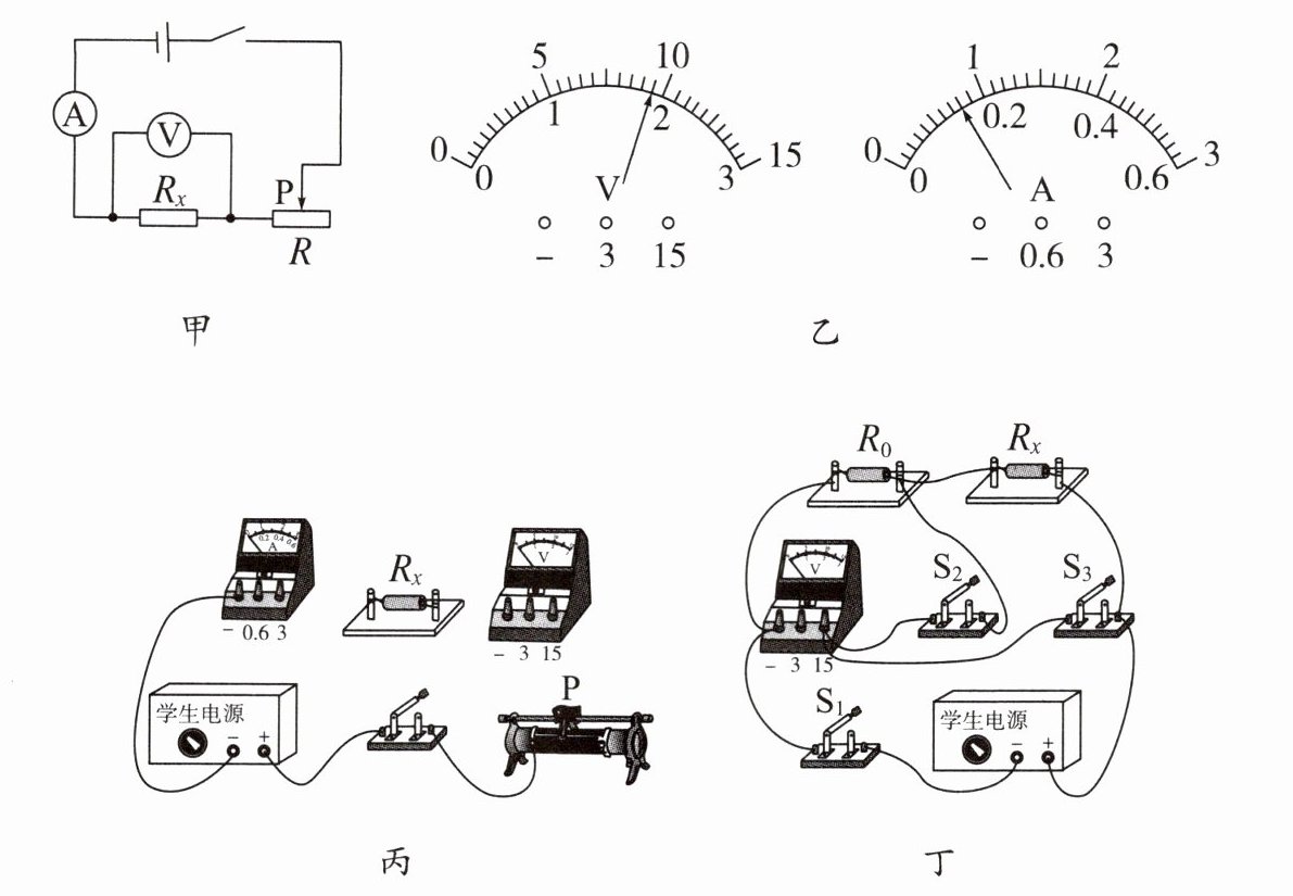 (4)该同学进行了实验创新,利用阻值为R₀的定值电阻和电压表等器材,测量阻值Rx。他设计了如图丁所示的电路,经检查无误后进行实验。请将实验过程补充完整:
