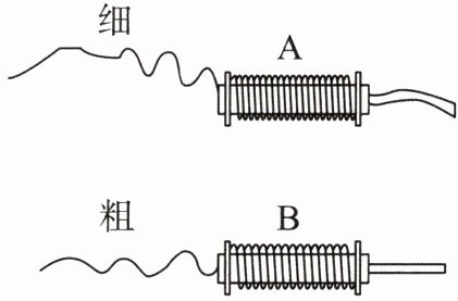 11. 右图为两个定值电阻A、B的内部结构示意图,A、B所用电阻丝(涂有绝缘漆)粗细均匀、材料相同,分别缠绕在相同的圆柱形绝缘棒上,圈数分别为55和33,A的电阻丝比B的电阻丝细。将A、B并联在电路中工作相同时间,通过分析说明哪个定值电阻消耗的电能多。