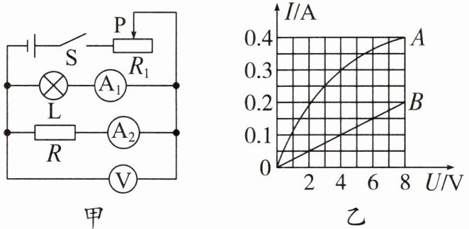 10. (2024·四川凉山州中考)小灯泡L和定值电阻接在如图甲所示的电路中,两者的I - U关系图像如图乙所示,图线______(选填“A”或“B”)是小灯泡的I - U关系图像,图线B所代表元件的阻值为______ Ω。当电压表的示数为8 V时,小灯泡L和定值电阻在10 s内消耗的总电能为______ J。