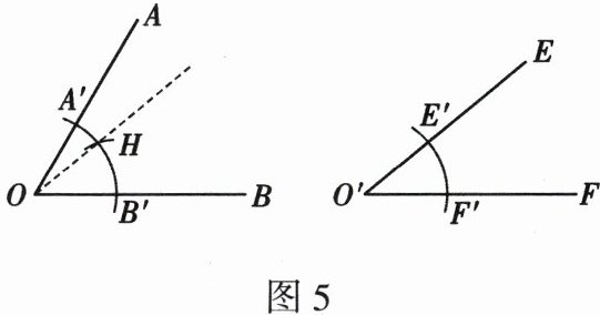 7. 如图5,已知∠AOB与∠EO'F,分别以O,O'为圆心,以同样长为半径画弧,分别交OA,OB于点A',B',交O'E,O'F于点E',F'. 以B'为圆心,以E'F'的长为半径画弧,交弧A'B'于点H. 下列结论不正确的是(