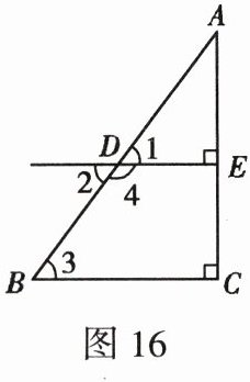 19. (9分)如图16,在直角三角形ABC中,∠C=90°,DE⊥AC于点E,交AB于点D.